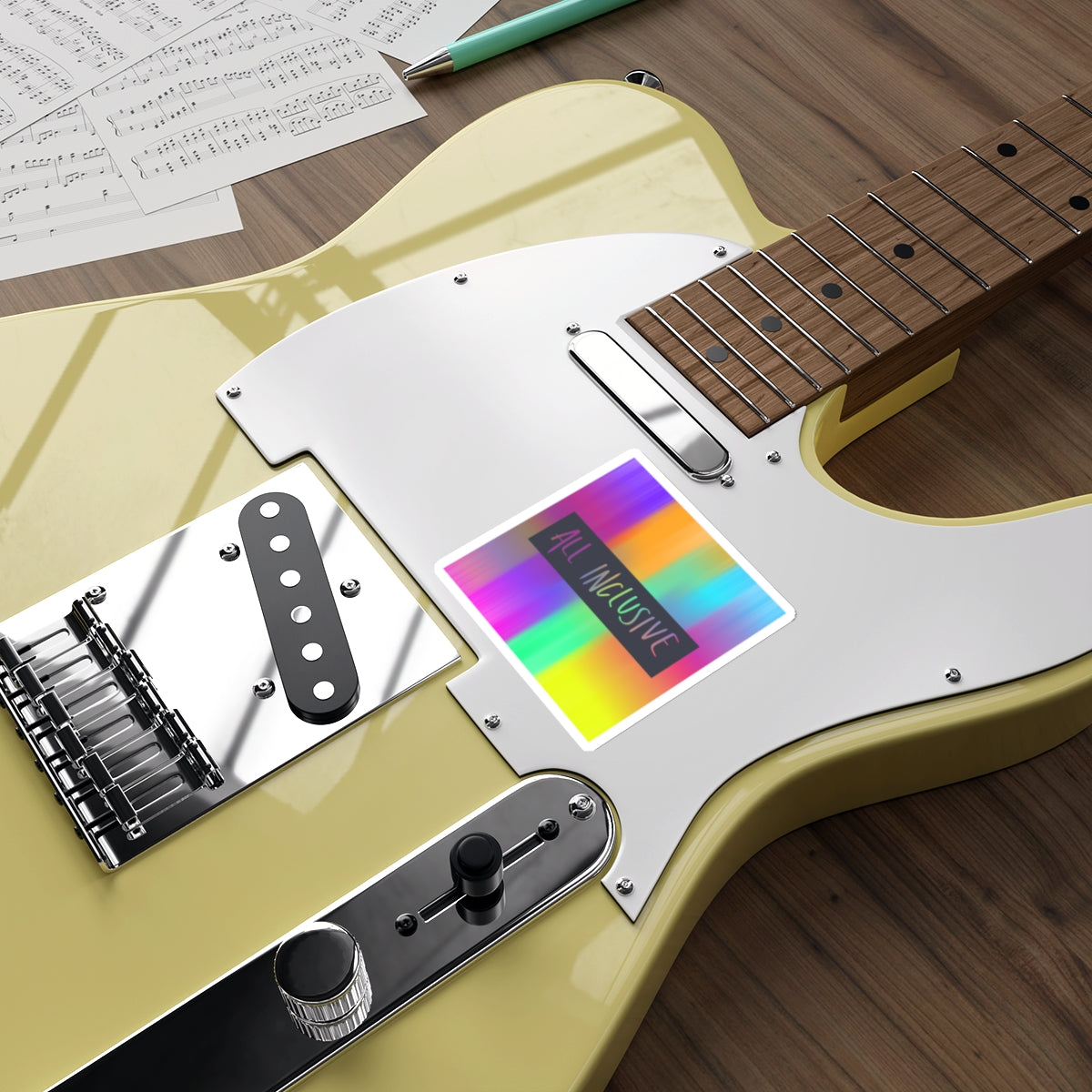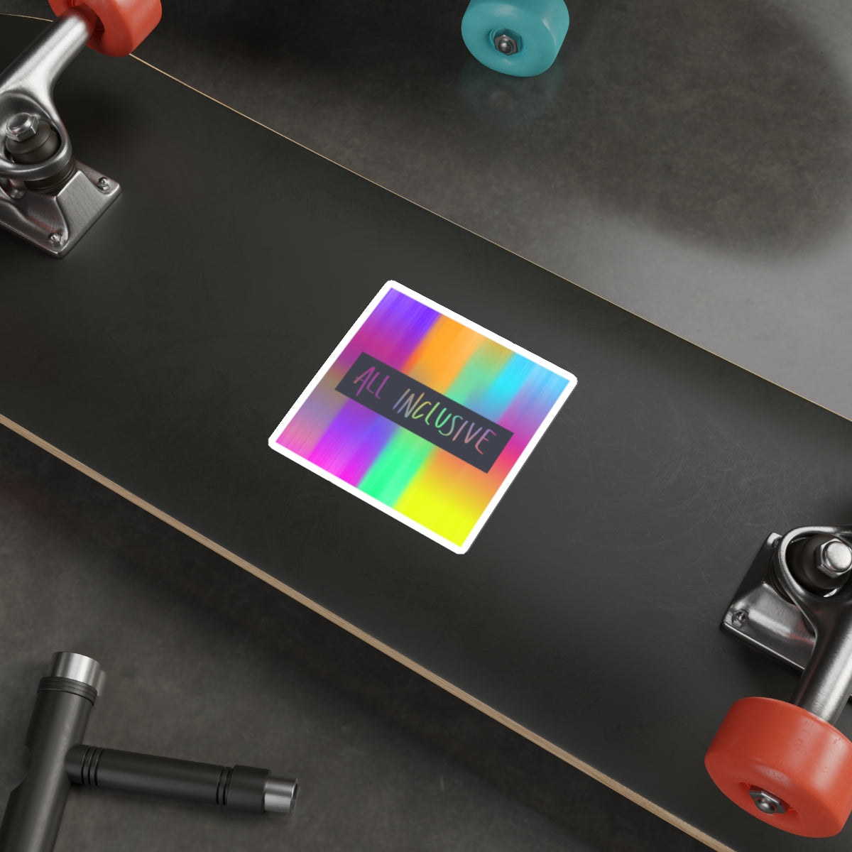 A multicolored sticker supporting LGBTQ+ rights with the message 'all inclusive'. This sticker gives off a positive and inclusive vibe, perfect for decorating laptops, water bottles, or notebooks. Ideal for individuals who are part of or support the LGBTQ+ community, this sticker is relevant for Pride Month, LGBTQ+ events, and everyday use.